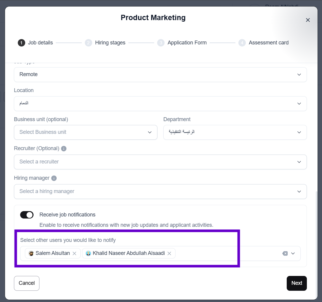 By enabling the “Receive Job Notifications” toggle and selecting users (who have viewing access to the Applicant Tracking System), they can view the job as "Watchers” and receive updates/notifications about all major events and actions taken at the job level.