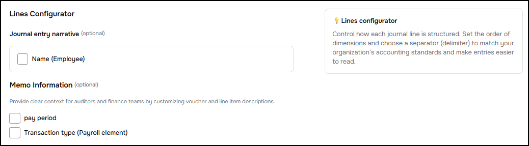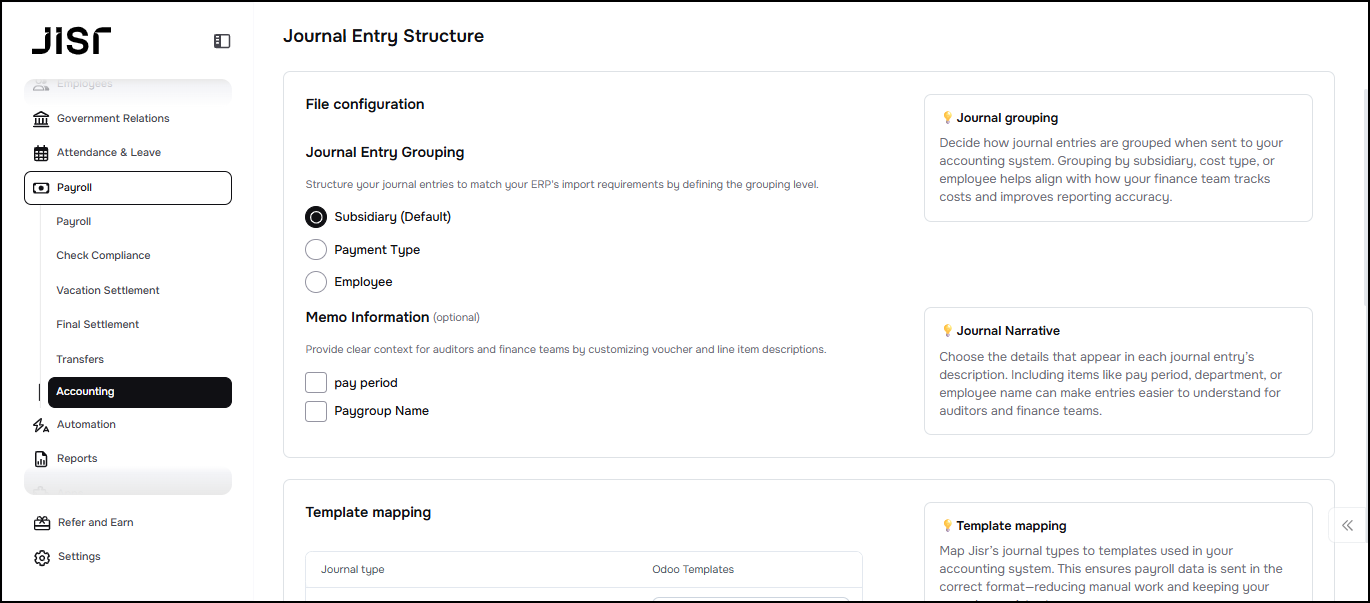 In this step, the admin needs to specify the display format of the accounting entry (i.e., the final format of the journal entries) to be either aggregated or detailed for each subsidiary company or cost center (if applicable) or at the employee level or based on the payment method.