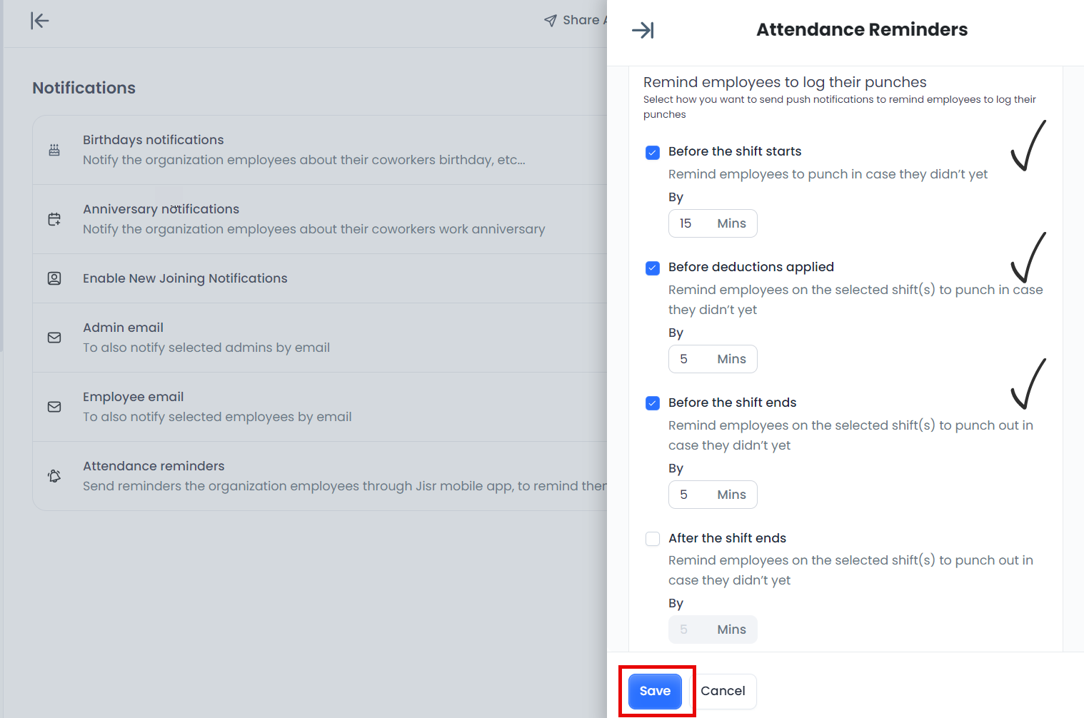 The attendance reminders is a notification which the admins can enable for employees to allow sending them notifications that remind them to punch in and out, before and after their shifts, or before deductions.