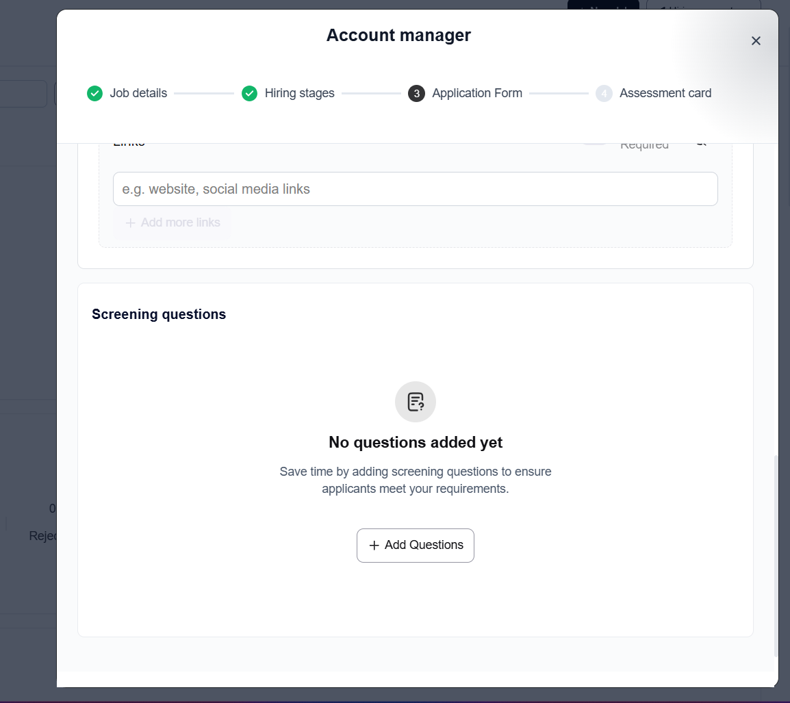 After completing all the steps to add a job, you will reach the 'Screening Questions' section, where you need to input the questions that candidates are required to answer. Click on 'Add Questions' to proceed.