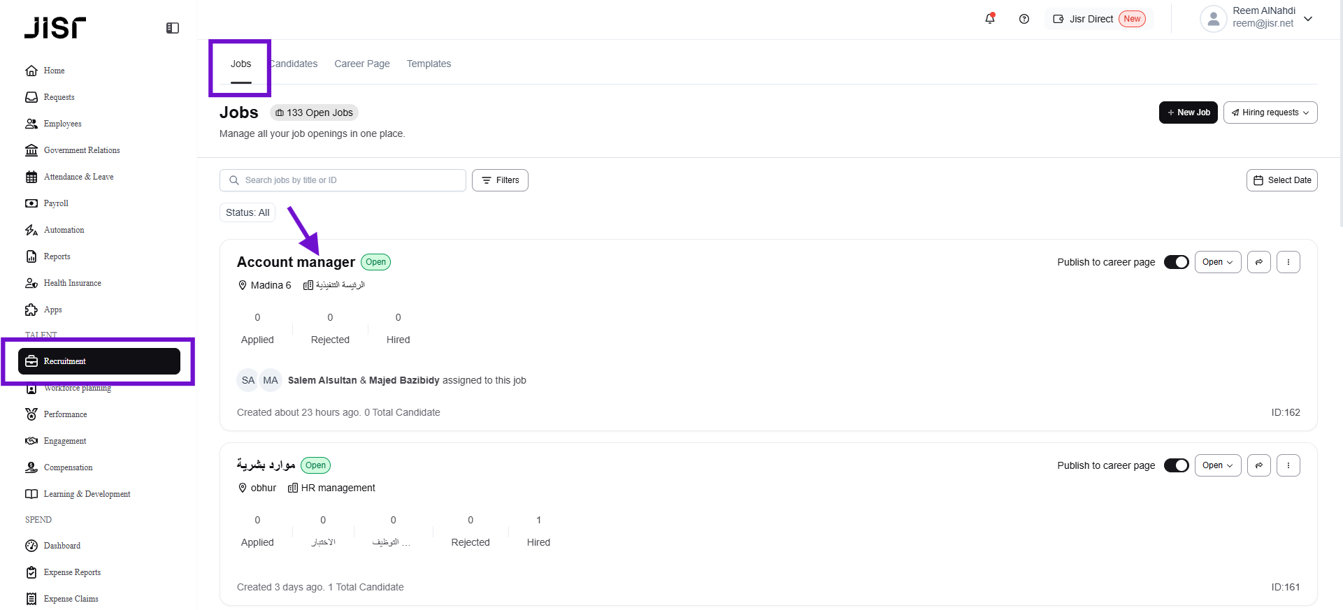 From the 'Applicant Tracking' tab on the home page, assessors should select the job with candidates who need to submit their assessments. Once the job is displayed, the candidates who applied for the job will be listed.