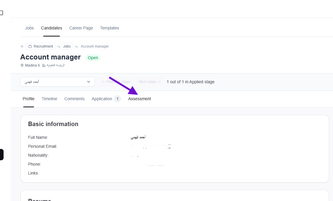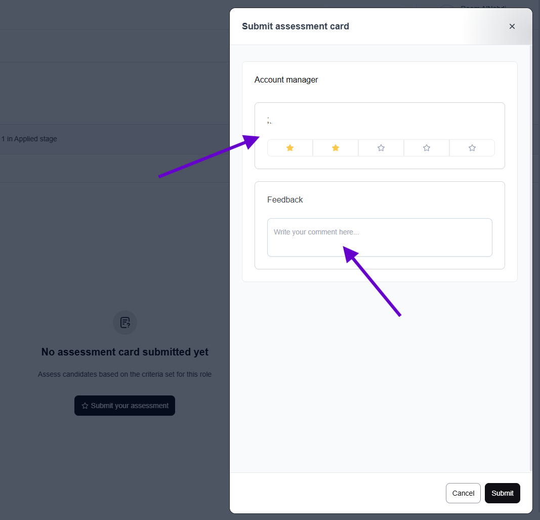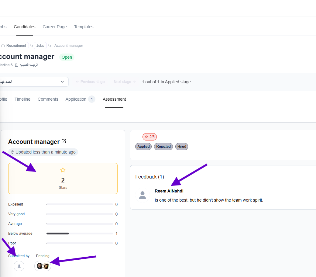 Please note that after submitting the assessment, the candidate's profile will display the overall score. Additionally, an 'Assessment' tab will appear on the profile, showing the score, the assessors who submitted their evaluations, and those who are still pending. Written feedback will also be displayed in this tab.