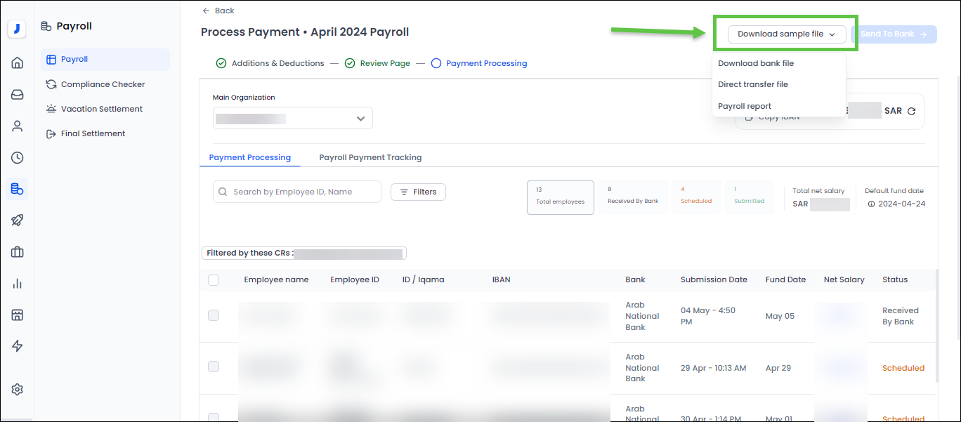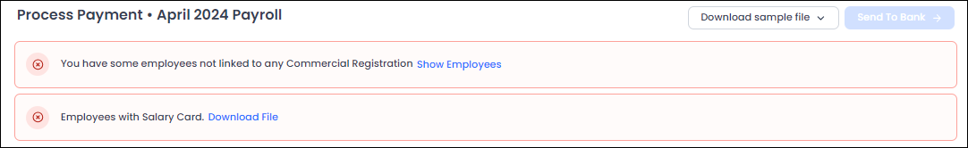 Note: It is not possible to send a salary to employees with salary card through Jisr Direct, so the user can download the file for the employees with salary card, by download the bank file, and then send it to the bank directly to send them salaries.