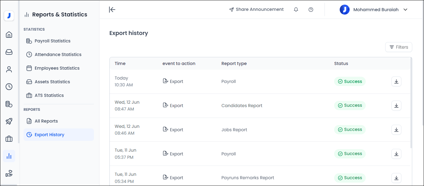 By clicking on “Export History,” the user will be shown all the exported payroll reports.