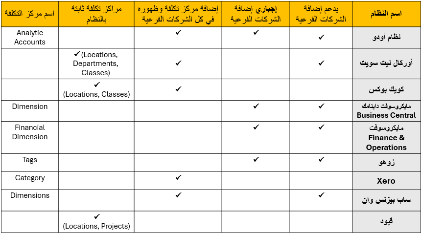 9- In which accounting systems is adding subsidiaries mandatory? What is the "Cost Center" name in each?