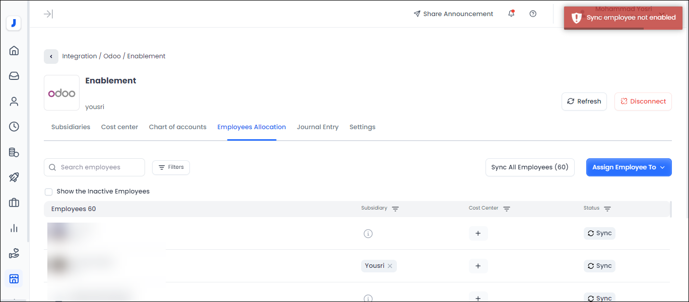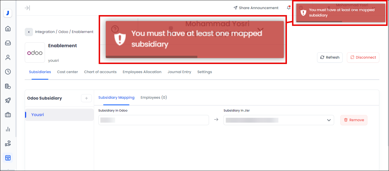Note: Some accounting systems in the integrating process require that the customer have at least one subsidiary company, and the solution in this case is that the user can integrate his own company (in the accounting system) into a designated subsidiary company (in Jisr system) and then add employees to the designated company from “Employees” tab or in the “Employee Allocation” stage.