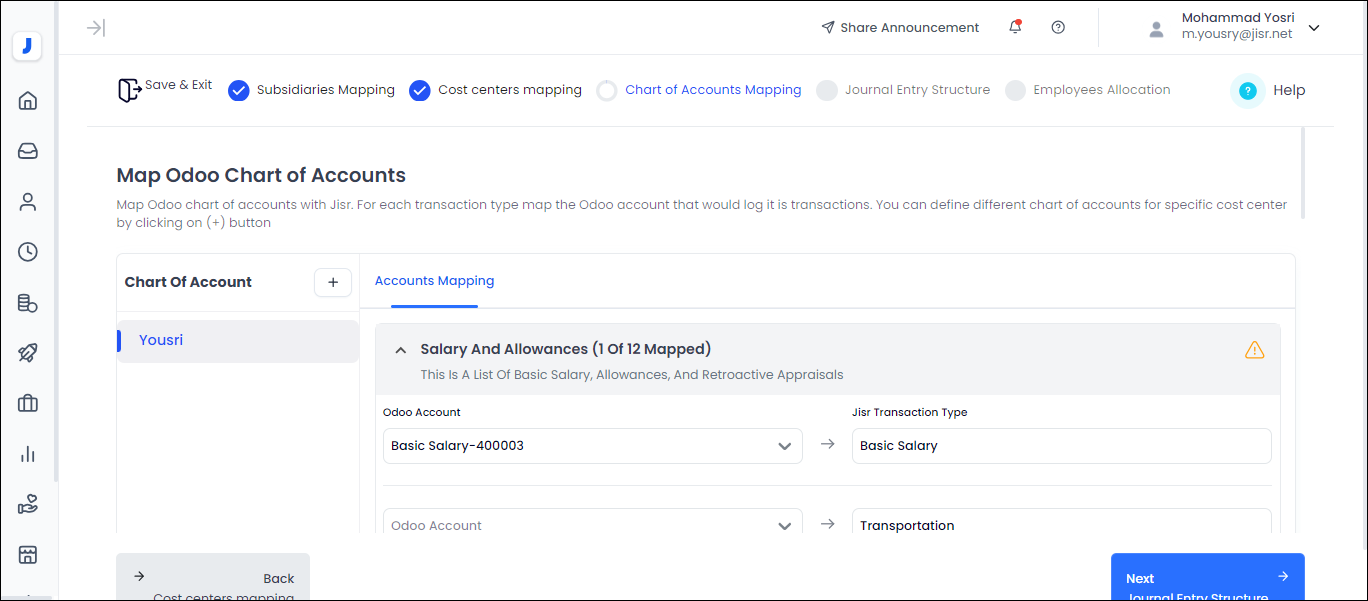 After mapping the cost centers is completed, we move to the next step, which is integrating chart of accounts with the corresponding financial Jisr transactions. If there is a special chart of accounts for each cost center, the user can add it via (+)