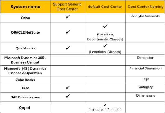 Note: Some accounting systems in the integration process allow the possibility of adding cost centers, some systems provide default cost centers in the system, and some systems show cost centers with a specific name. For example: the cost center in Odoo system is named as "Analytic Accounts".