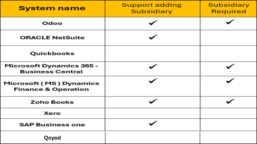 Below are the systems that support adding subsidiaries and which systems mandate adding one subsidiary at least to process the integration: