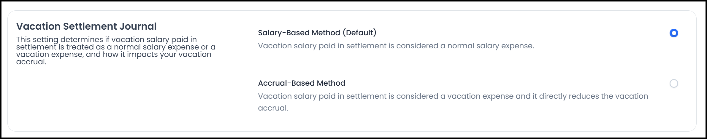 The user can choose the vacation settlement journal and specify whether vacation pay paid in the settlement is treated as a regular salary expense or a vacation expense.
