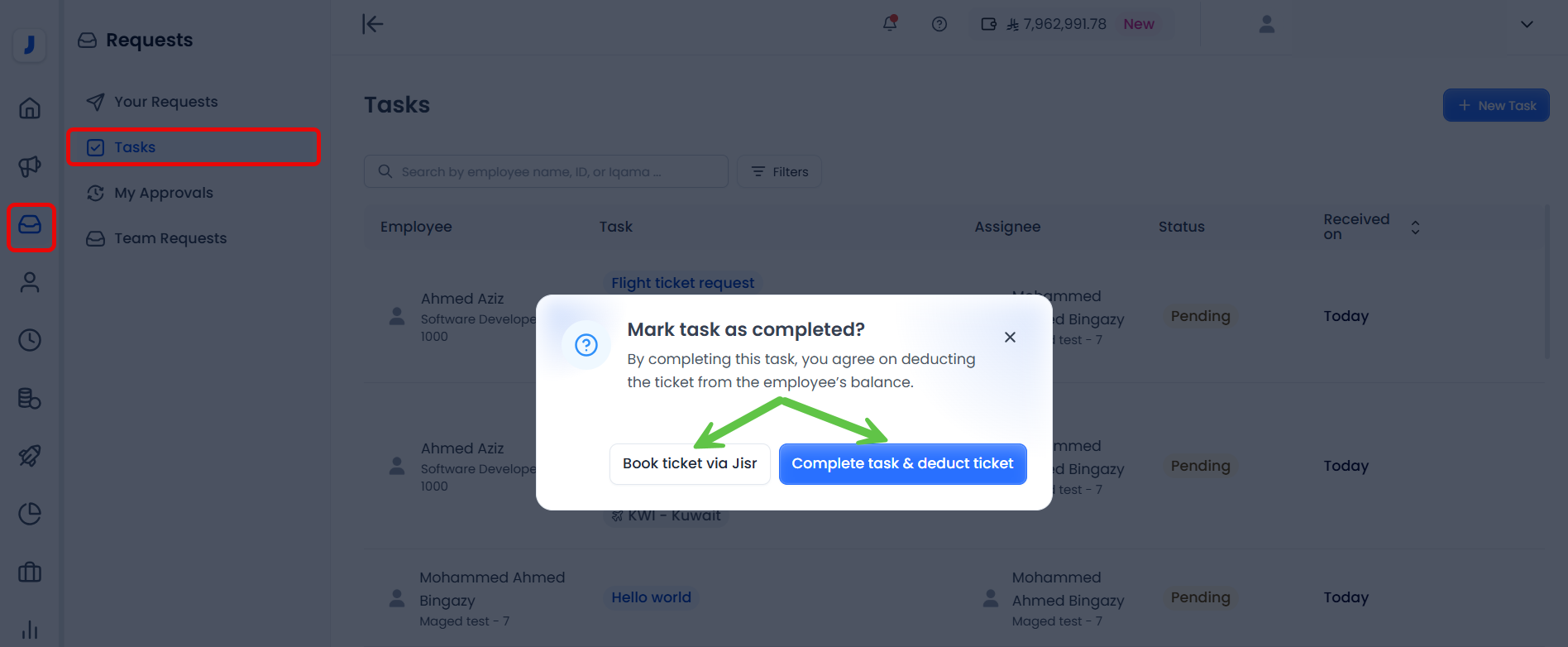 2. When the responsible user selects "Mark as completed" for this request, which will deduct the ticket from the employee's ticket balance, the system will present two options: either book the ticket through Almosafer, which will redirect the user to the Flight Bookings tab to complete the booking via Almosafer, or simply complete the task and deduct the ticket balance without booking.