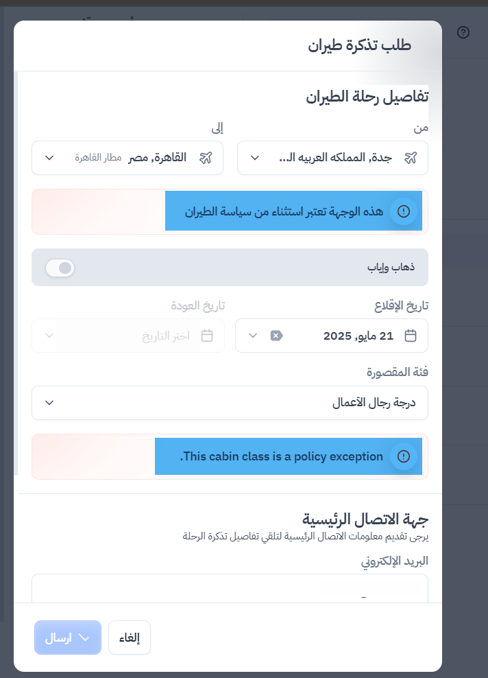 If a destination or cabin class different from those specified in the employee’s flight ticket policy is entered, the system will display a notification indicating that the destination is considered an exception to the policy. However, the user will be able to proceed with the request if the employee’s policy includes the "