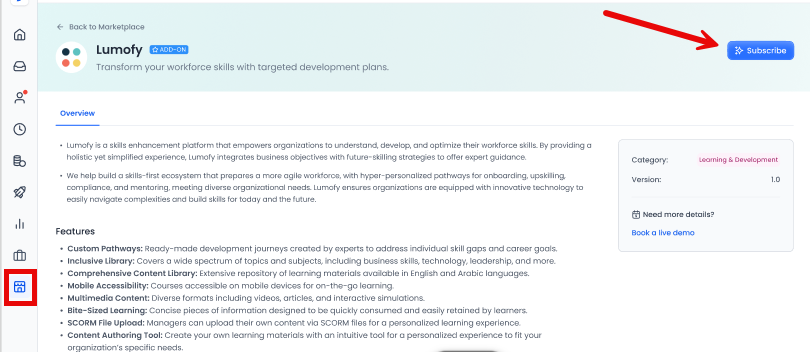 To offer customers a seamless and integrated experience with advanced learning solutions, we have added a subscription to the Lumofy Learning Management System (LMS) through our marketplace. This integration with Lumofy aims to provide optimal plans for employee development and strategic competency enhancement, ensuring easy and direct access for customers.