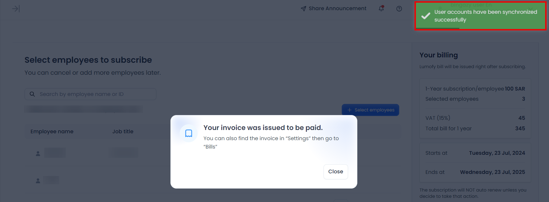- After adding the employees, the billing details will appear, including the start and end dates of the subscription. More details of the pricing fees according to the included employees.
