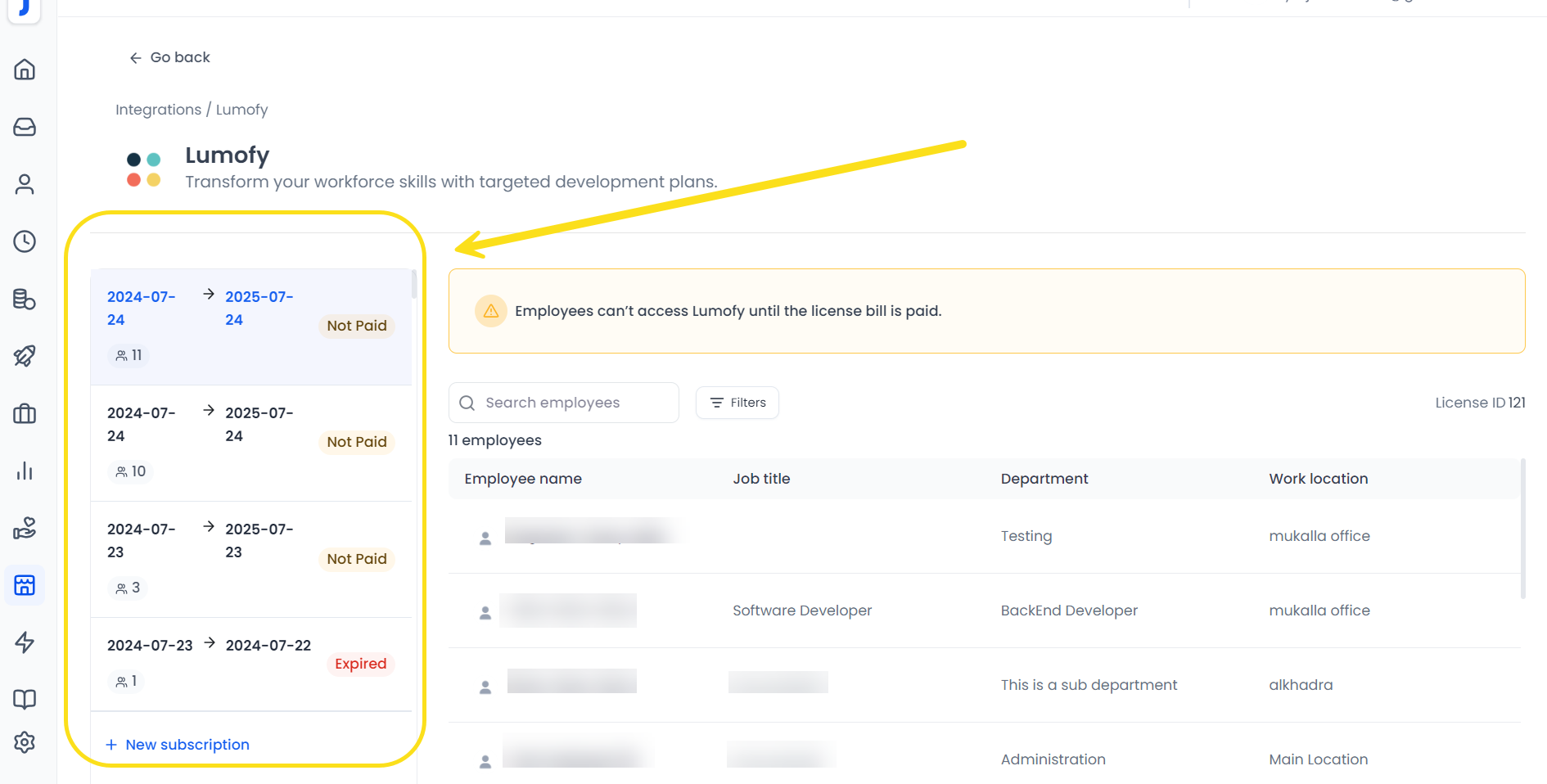 3. The listed subscriptions will be displayed along with the enrolled employees for each subscription.