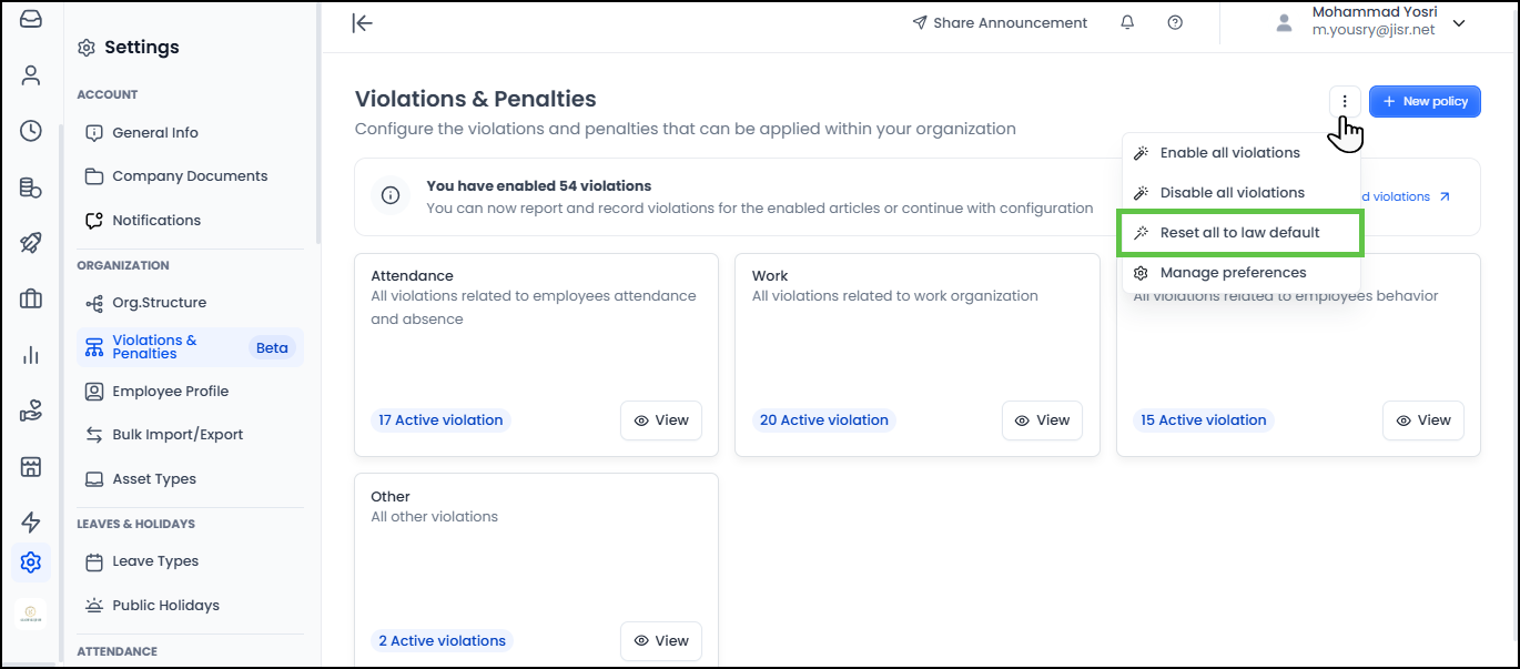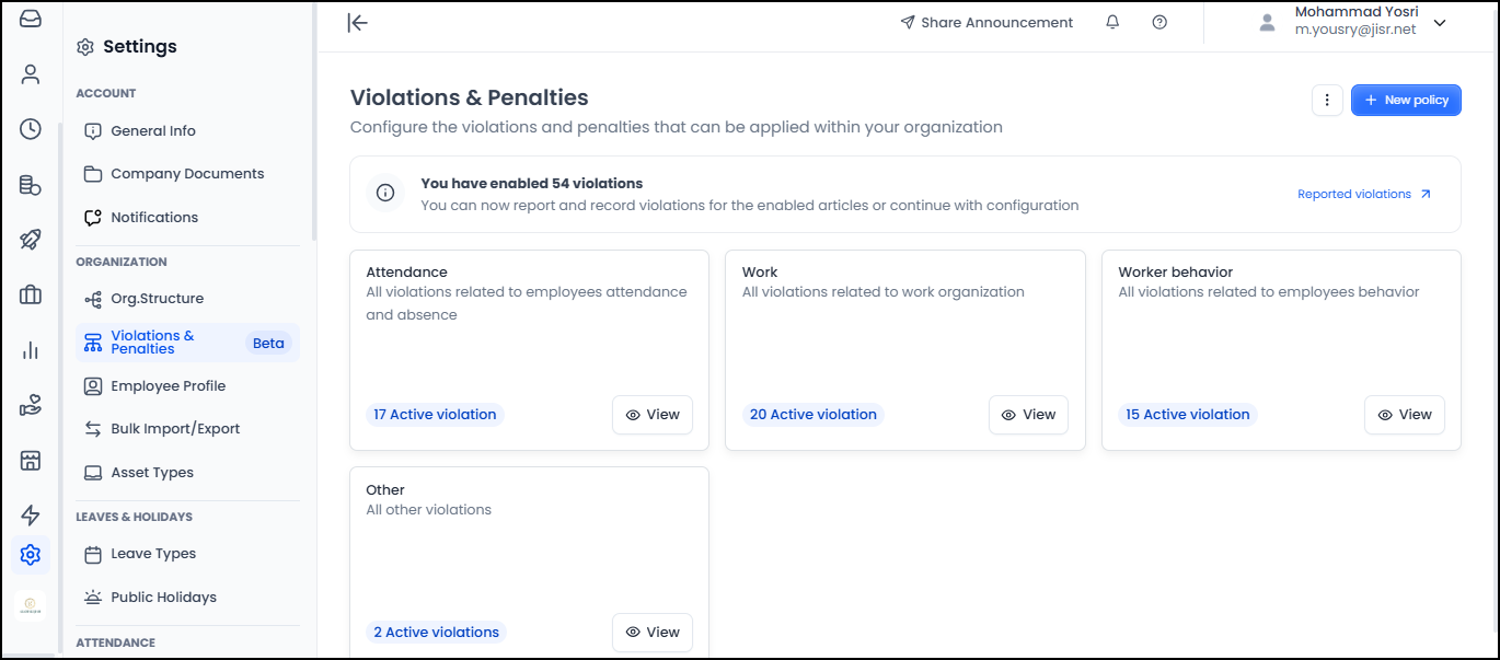 Answer: The Jisr system allows users to define penalties for the following types of violations: