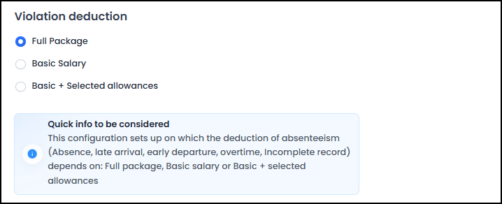 Answer: No, the user can specify which salaries the penalties are deducted from, including the "Basic Salary," "Full Package," or "Basic Salary + Selected Allowances." The user can choose the allowances to add to the basic salary from which the deduction will be made.