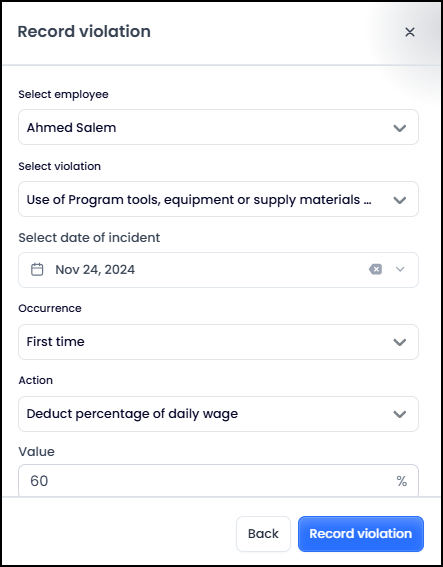 A violation recording screen appears, where the user enters required data, such as selecting the employee, violation date, number of occurrences, required action to be taken, and the reason.