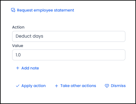 Answer: Yes, the user can change the action unless the action has already been applied to the employee. By clicking on "Take Other Actions," the user can change the designated action for the violation (such as deducting pay for days off, issuing a warning, withholding bonuses, etc.), input the action value, provide any notes on the violation, and then click on "Apply Action."