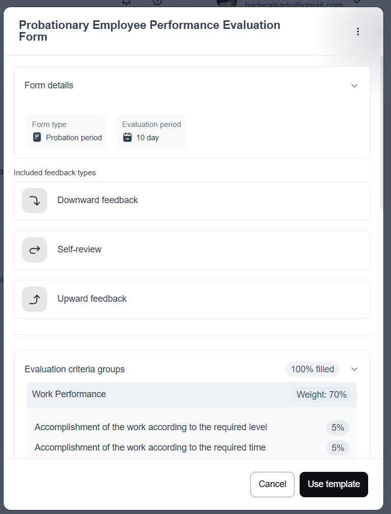 The templates' feature allows employees to participate in defining the criteria or objectives on which they will be evaluated in the evaluation form. This is achieved by enabling them to create an evaluation form using one of the available templates and submitting it for approval by the performance manager.