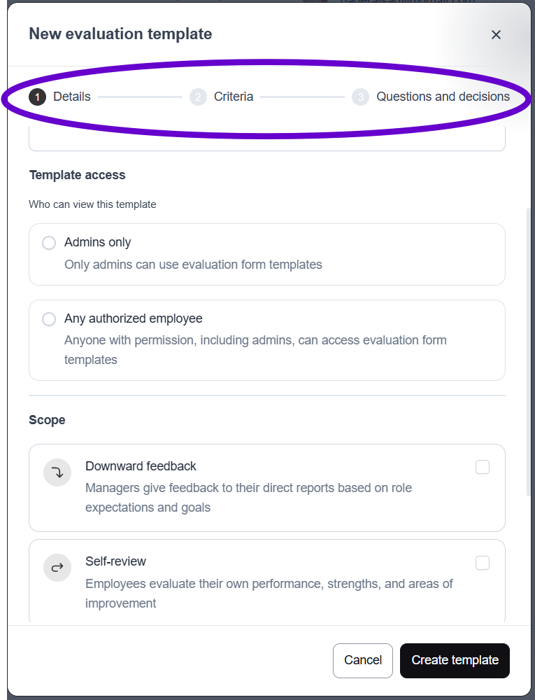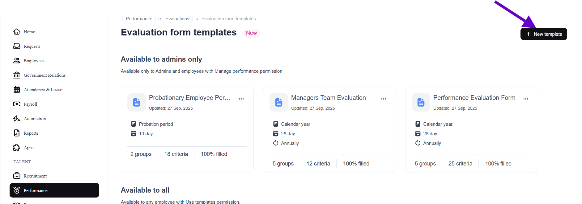- The template creation feature is only available to users with performance management permissions.