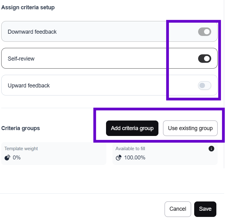 - Form scope: included, self-review, upward feedback & downward evaluation.