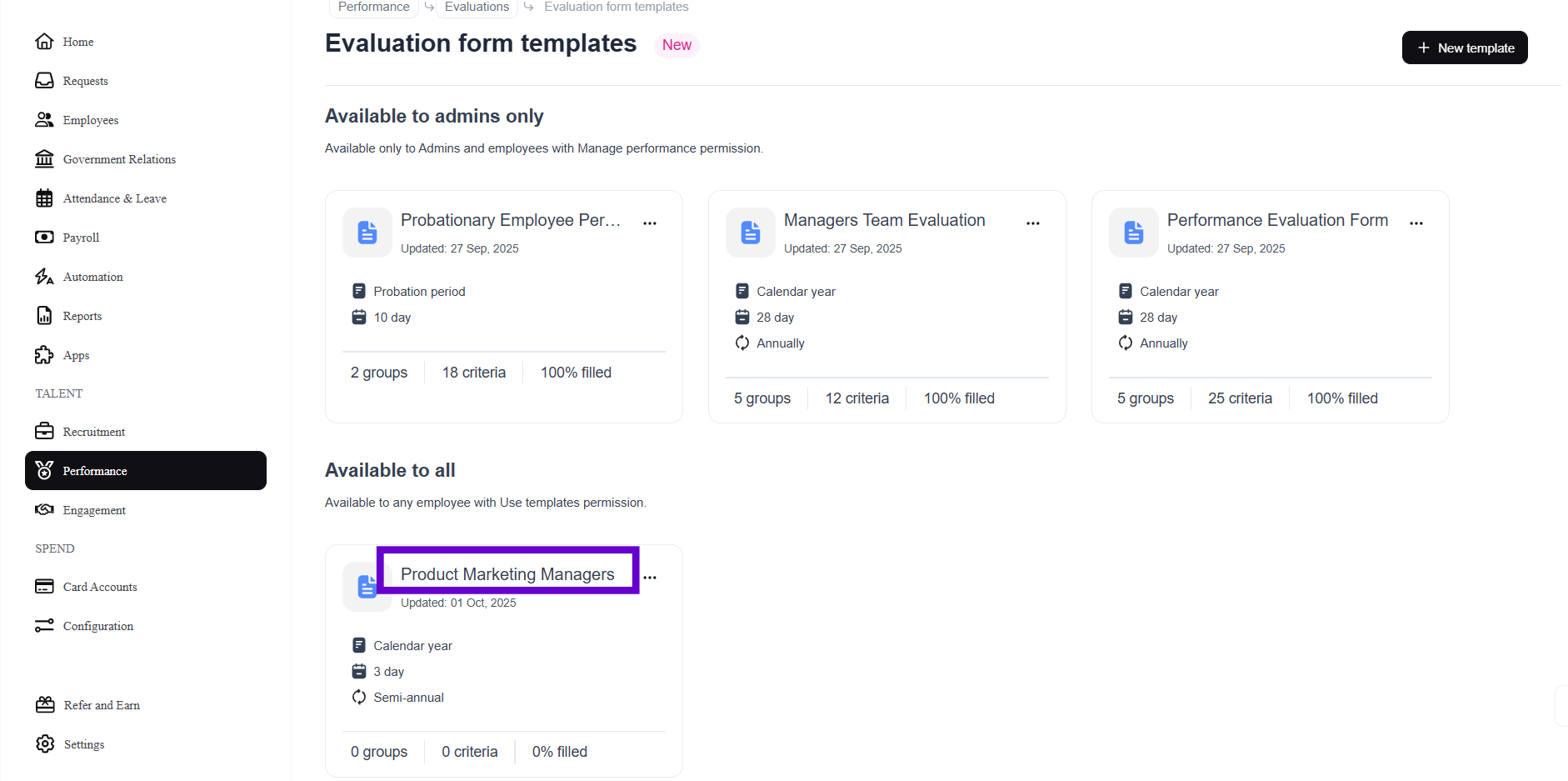 When the criteria is filled, the template will be displayed under 'Evaluation form templates'.