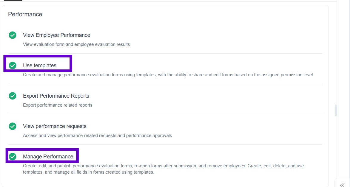On the Templates page, there will be two sections: one for templates exclusively available to managers and employees with 'Performance Management' permissions, and another for templates available to all users with the 'Template Usage' permission.