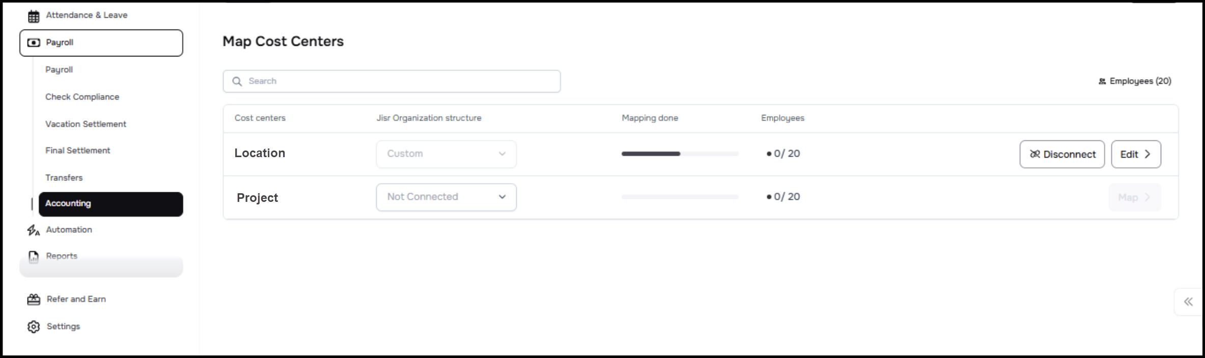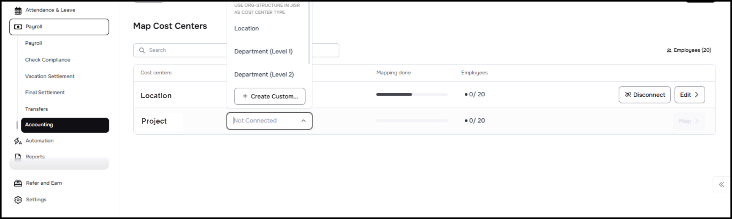 For each cost center type, the admin would map it with one of the following options available in Jisr:
