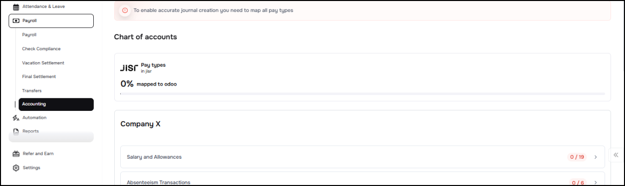 In this step, The admin can map the Qoyod chart of accounts to Jisr transactions, so that any transactions that happen in Jisr will get posted to the appropriate accounts on the chart of accounts.