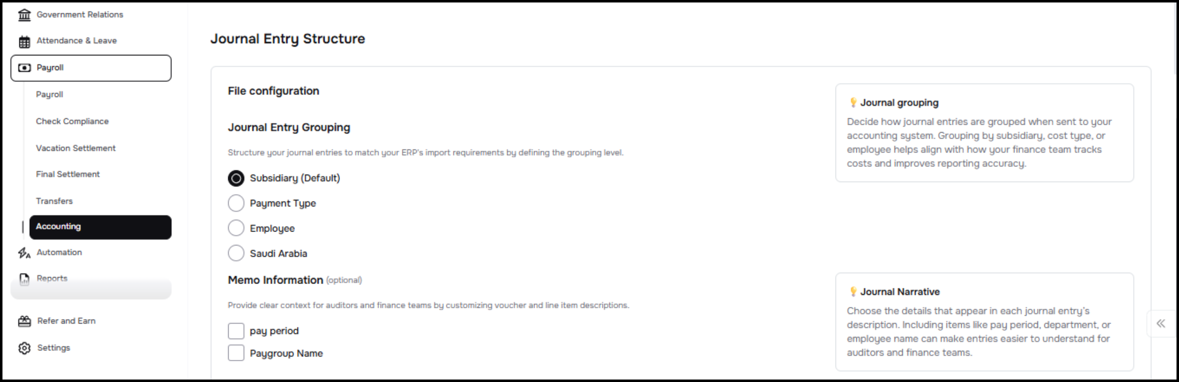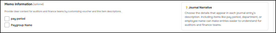Once the admin activates this configuration, it would help to select required cost centers and employee information that would be included in the journal entry lines.