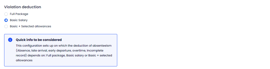 5- The user goes down to the "Violation deduction" tab and chooses which salary specifically will be deducted from, whether it will be deducted from the "Basic salary" or "Full package" or "Basic salary + selected allowances" where the user can choose the allowances to be added to the basic salary and from which the deductions will be made.