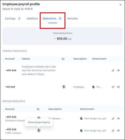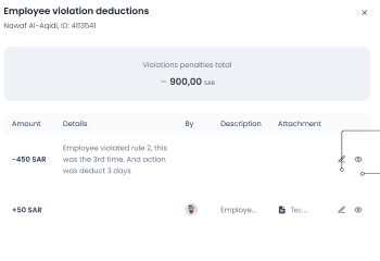 Note: If a violation is recorded against an employee, even if it is old and dates back to the previous month's salary, the deduction will appear on the current month's payroll.