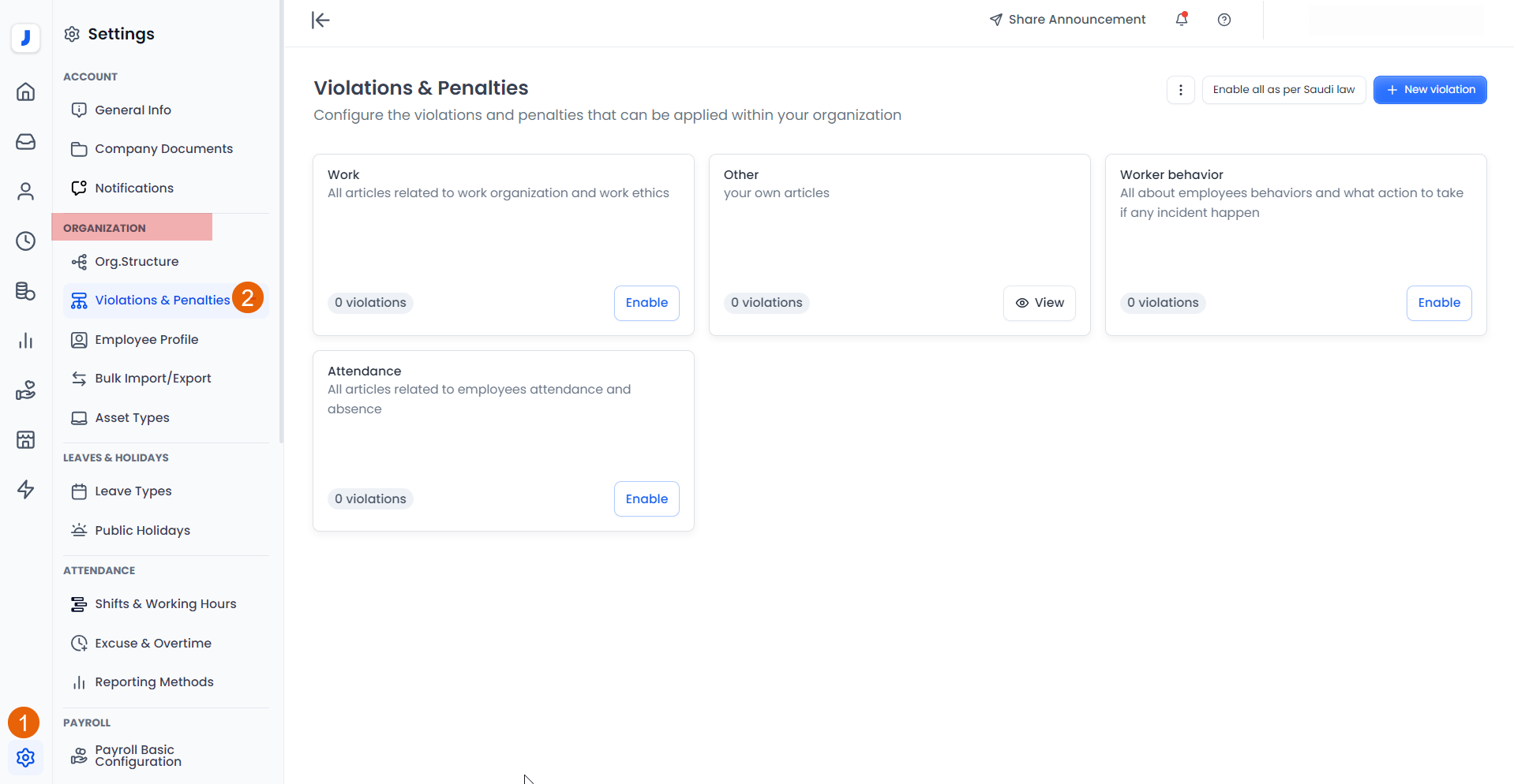 To begin working with the violations and penalties module in your Jisr account, the company’s violation policies and corresponding penalties must be activated to the system to specify which rules in each area will be enforced and which will not.