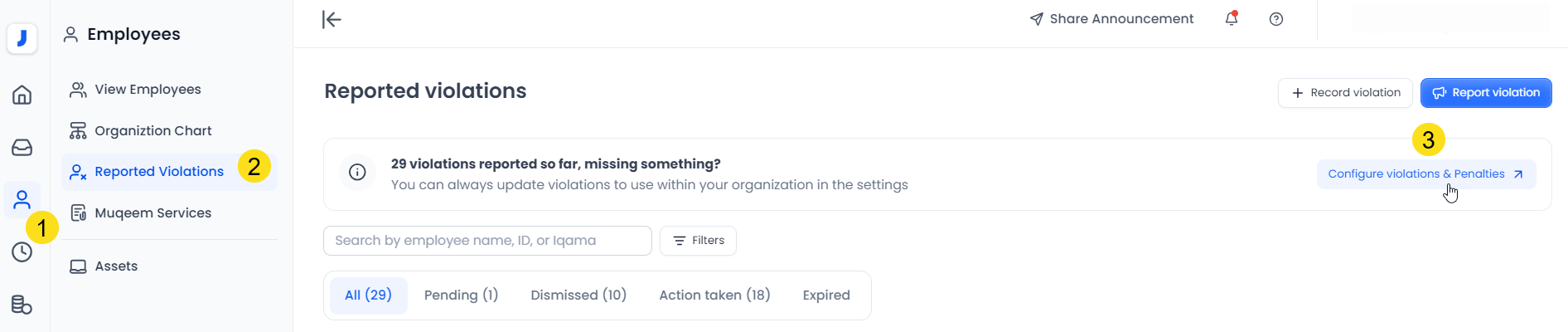 Under the Employees tab, the reported violations page will display all previously reported violations, if any. Additionally, there is a 'Configure Violations & Penalties' button that redirects to the settings.