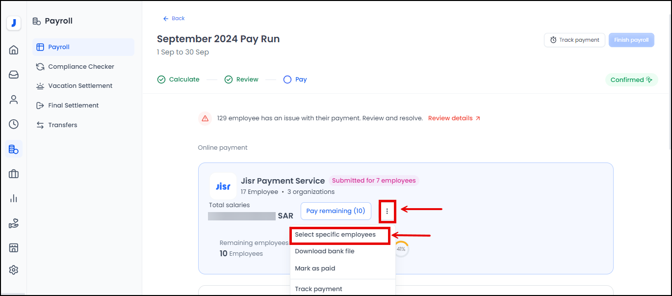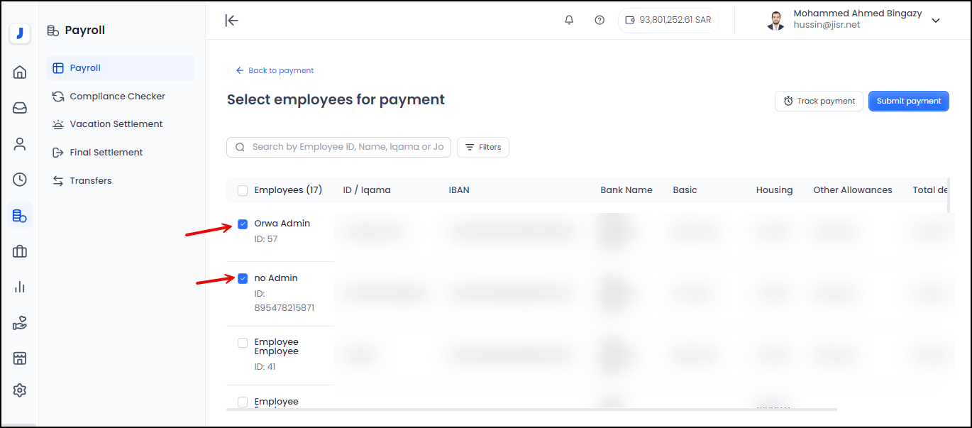 The Jisr system allows the user to choose specific employees to whom salaries will be transferred, but not the rest