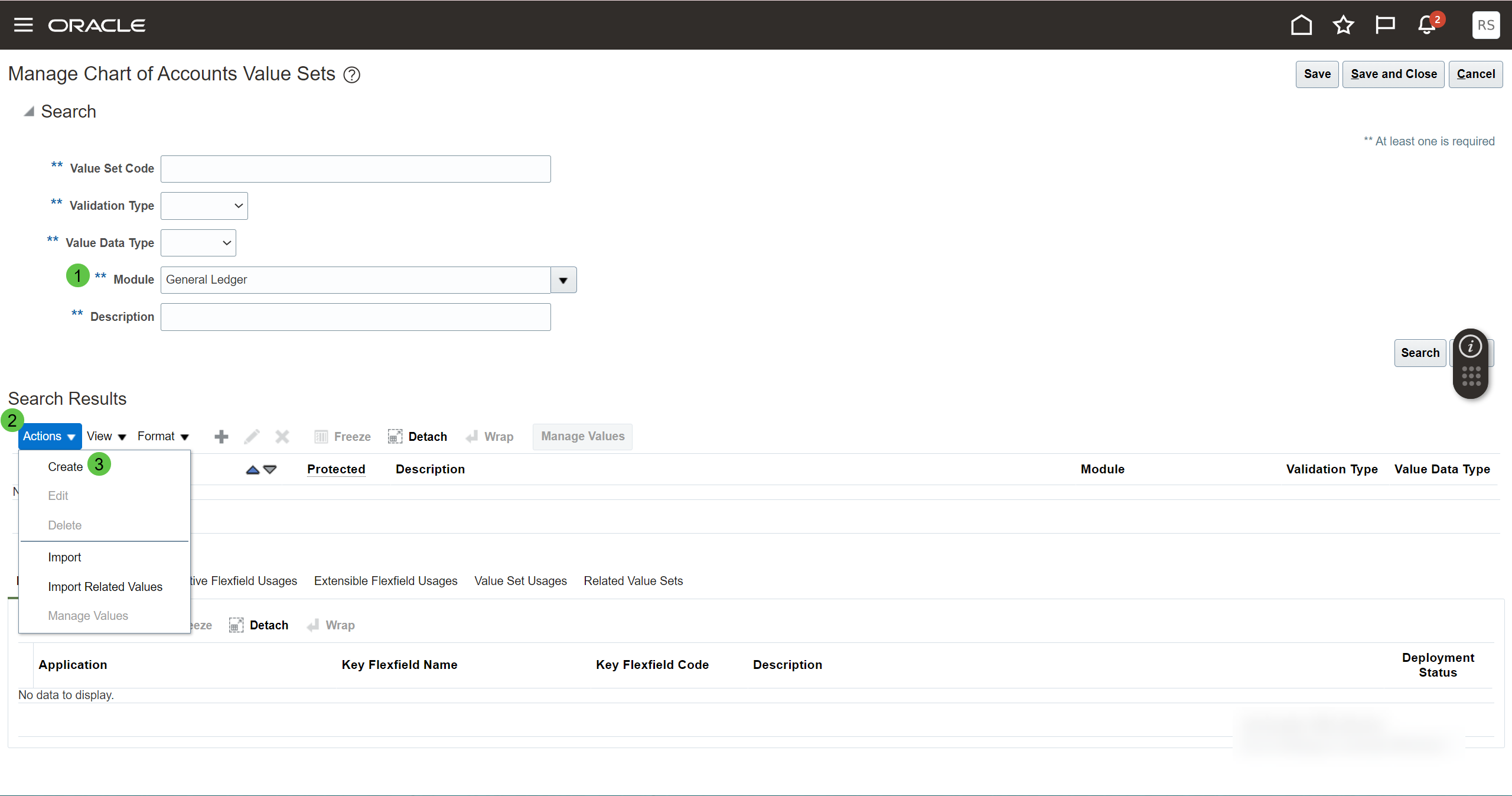 Then the user chooses the module "General Ledger", then under the search results, the user clicks on Action, then Create.