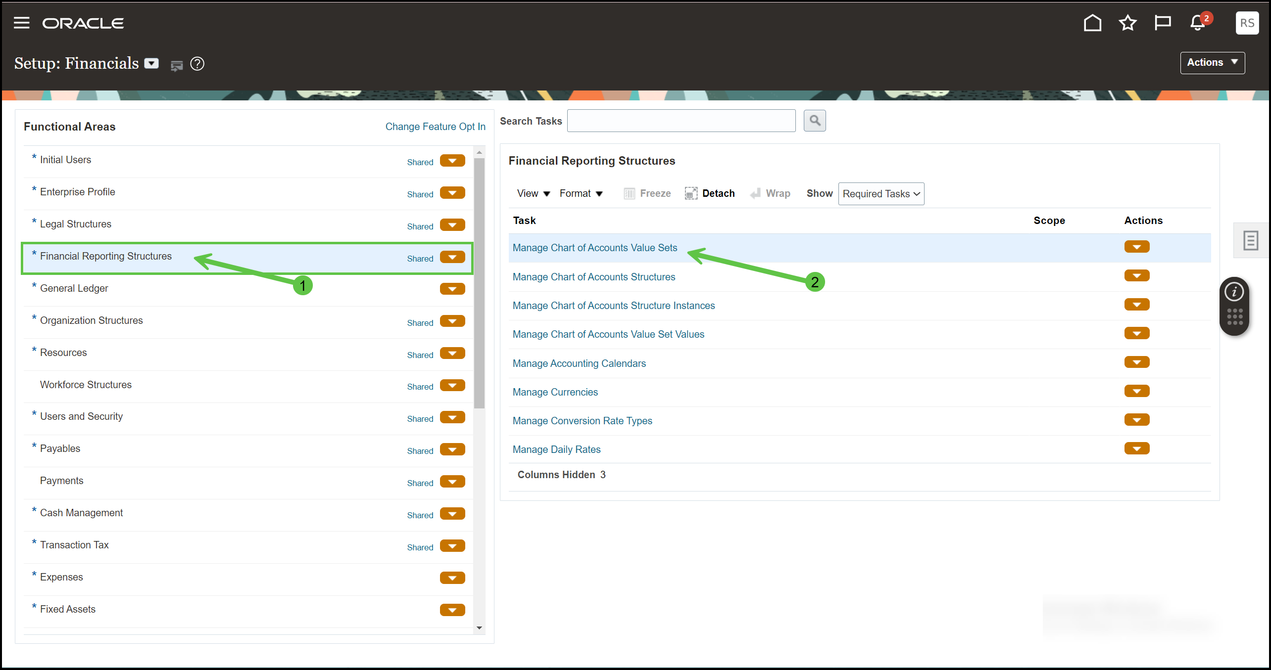 3- Then by clicking on financial reporting structure, manage chart of accounts value sets.