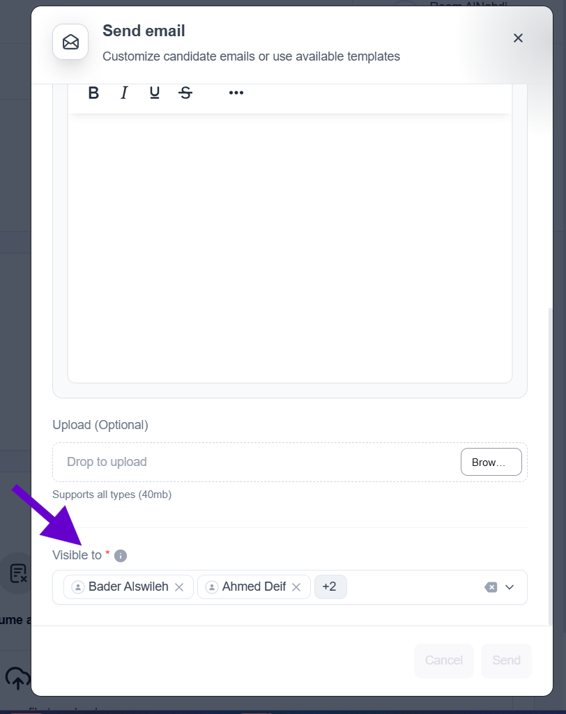 - Control the visibility of the email details by specifying roles or users who can view it in the candidate profile timeline.