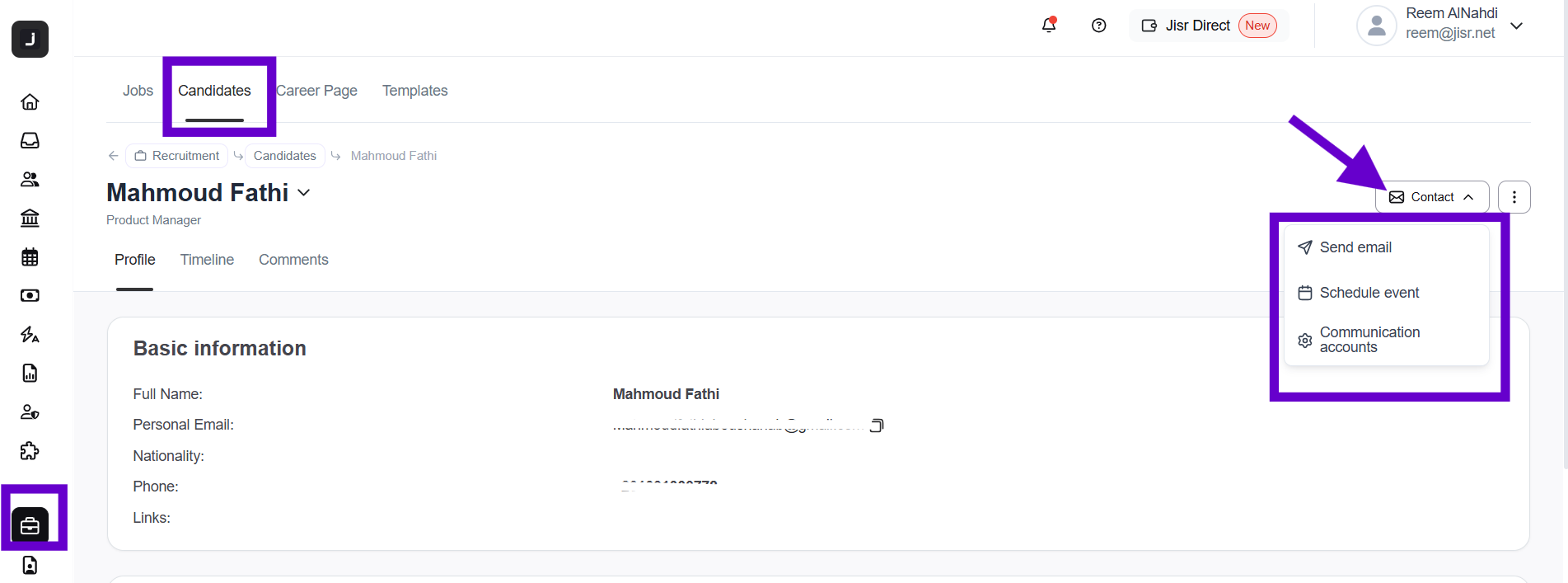For this reason, the entire process should be managed in one platform to avoid the complications that can arise from using multiple tools and channels. In Jisr, users can manage all their communications directly from the ATS system, simplifying the process for recruitment teams.