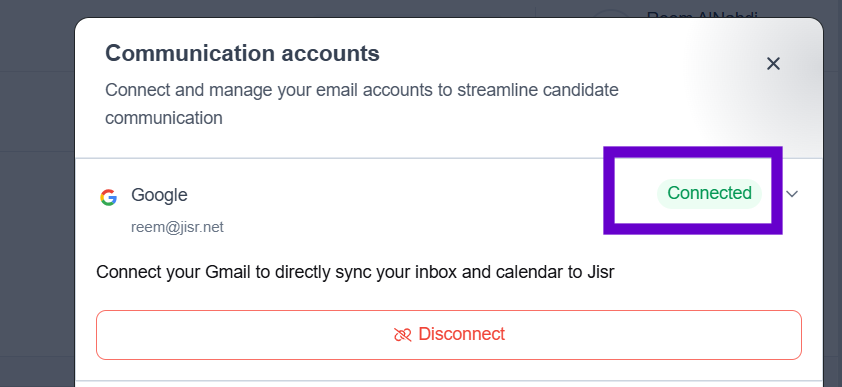 - Once you click "Connect", an external window for the selected platform (Google or Outlook) will open, allowing you to authorize the connection between your account and Jisr.