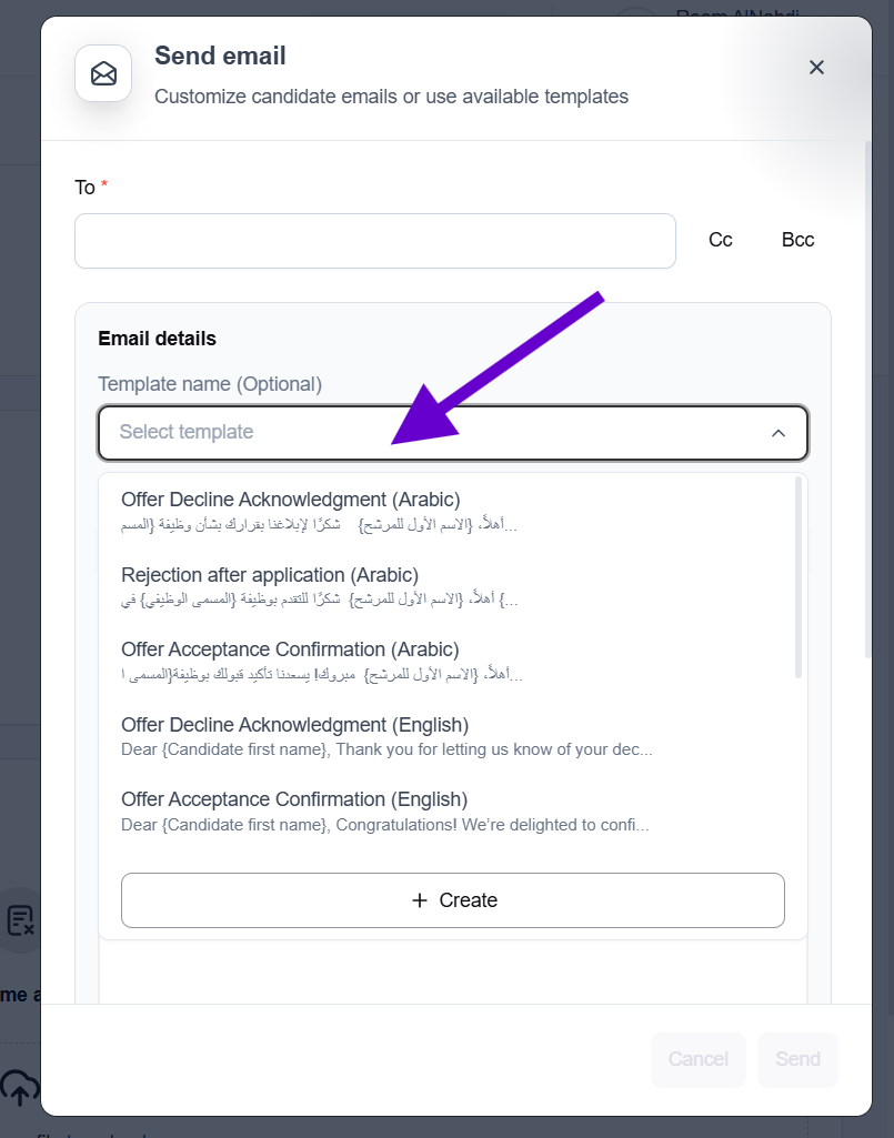 - Select a saved template with pre-written content to use as an alternative to writing a new email from scratch.