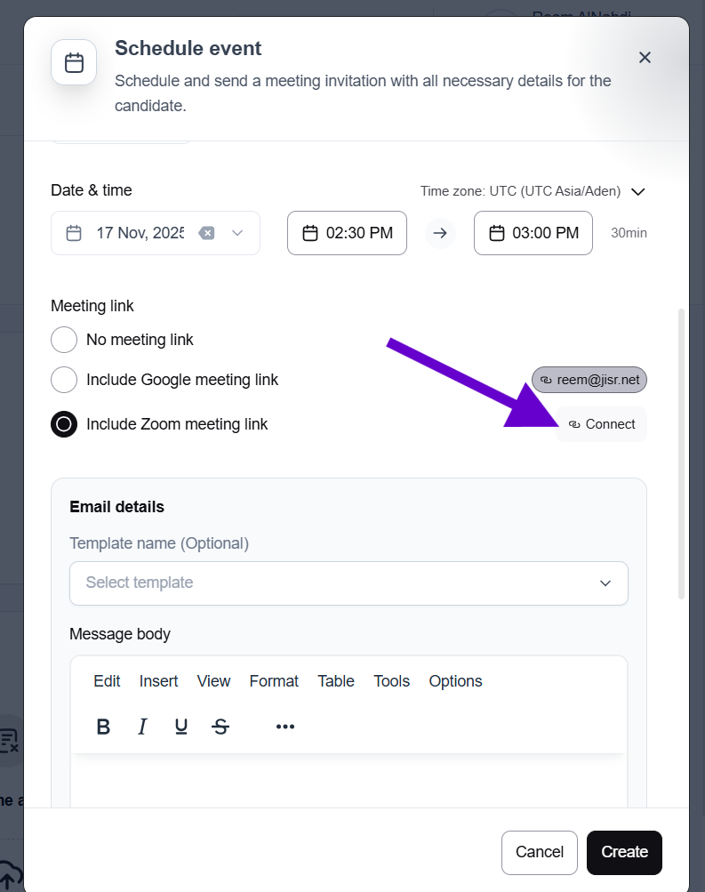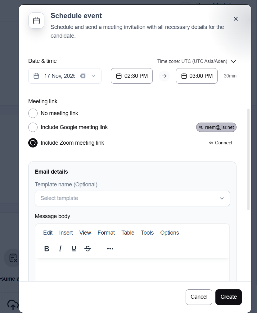 - Include Zoom Meeting Link: This will create a Zoom link, which will be attached to the email. The event will be created using the Zoom integrated with the system.