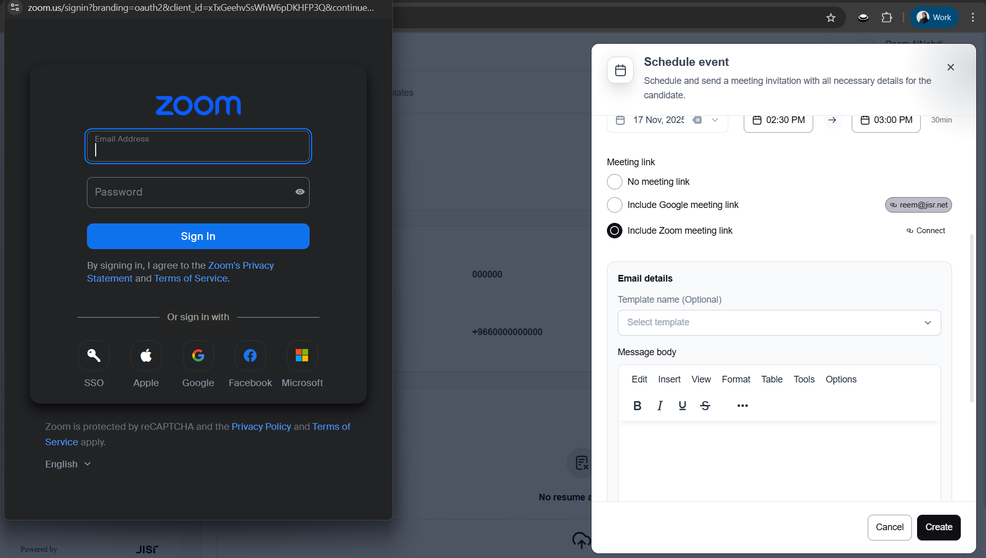 And if you proceed with linking to Zoom, a window will also open to complete linking your Zoom account with Jisr.