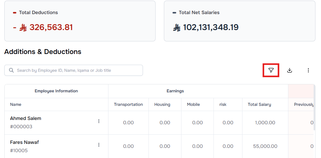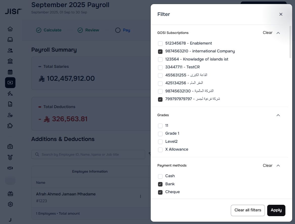 For example, the user can choose which companies the employees belong to and by choosing the company, all the data of the employees in this company will appear, and the employees can also be selected according to the payment method, nationality, job titles, types of employment contracts, work units, etc.