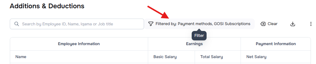 5- The pop-up screen appears, which helps the user to sort the employee data by the data that will be selected to filter the employees who appear to view their data in the payroll easily.