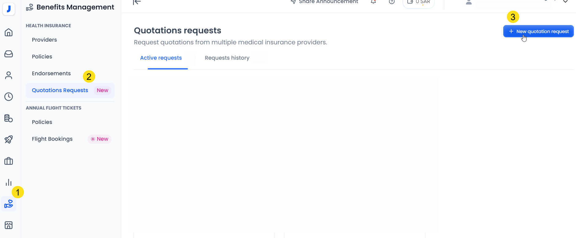 Click on 'Benefits Management,' then select 'Quotation Requests' under 'Health Insurance'