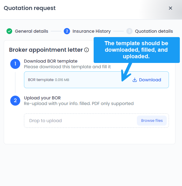 Broker appointment letter: This step requires entering the broker appointment letter, which authorizes the broker to act on behalf of the company. A template is available for download, to be filled out and re-uploaded.
