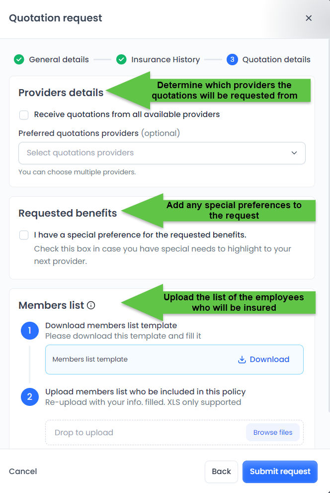 In this step, as it is the company's first time filing a medical insurance claim, only the details of the required providers, any special preferences, and the list of members will be included in the quotation requests.