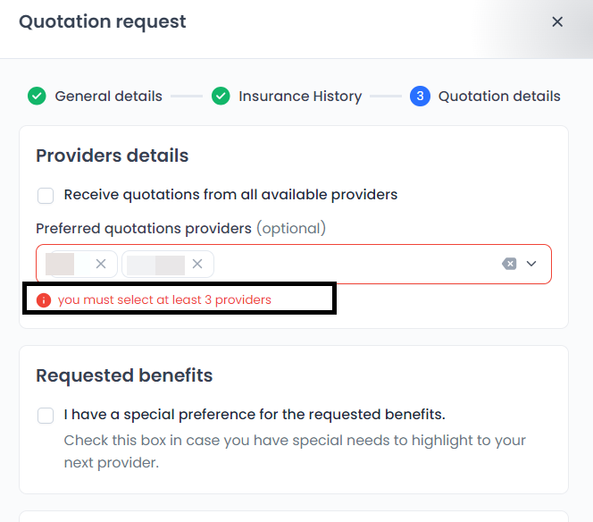 Please note that at least three providers must be selected to proceed, unless the option to receive quotations from all providers is chosen.